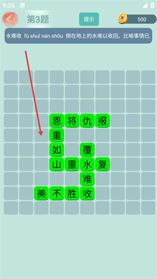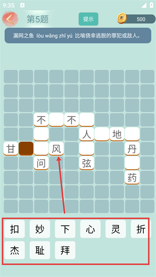 4、答题界面,将红框标注的字,填入箭头指向答题区空位,需拼接对应成语。