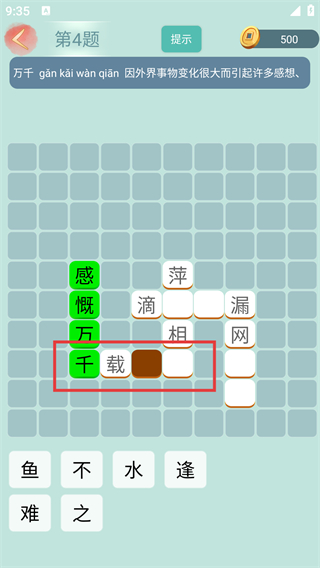 2、初始答题界面,红框标注“千载”旁空位,将下面零散字填空进去。