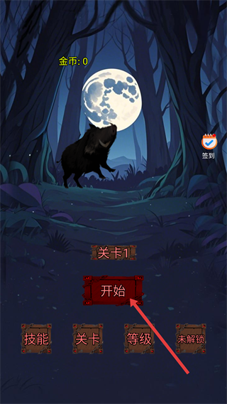 1、进入界面后,可点击【签到】获取奖励,选择【关卡1】对应的【开始】按钮,进入关卡前的准备环节。