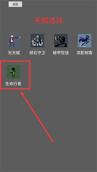 2、进入【天赋选择】界面,可挑选不同类型天赋,此处选中【生命行者】,该天赋侧重生命相关属性的调整,适配特定战斗需求。