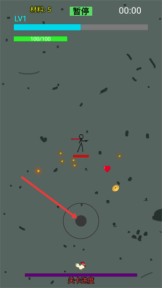4、进入关卡战斗界面,通过操控区域控制角色,收集【材料】-【金币】等资源,关注【关卡进度】条,可点击【暂停】调整战斗节奏。