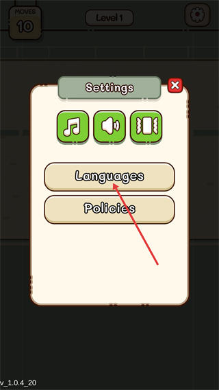 1、在【Level1】关卡界面,点击右上角【设置】按钮,可进入设置页面调整游戏相关选项,同时可查看当前剩余【MOVES-10】步数。