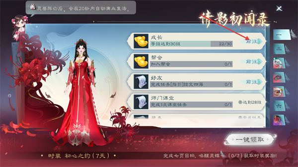 2、进入【倩影初闻录】界面,完成所有任务,可获取【初心之约(7天)】时装奖励。