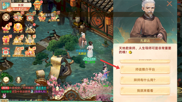 3、与孔颖达对话,选择【师徒推介平台】,进入师徒推介界面。