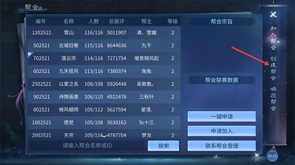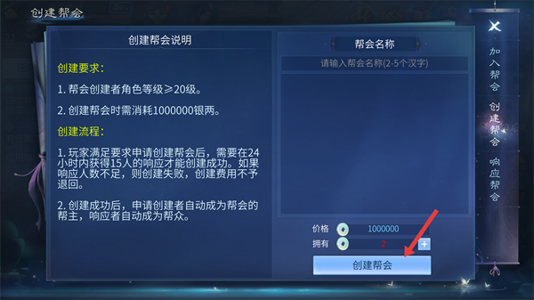4、输入帮会名称,满足条件后点击【创建帮会】按钮,提交帮会创建申请。