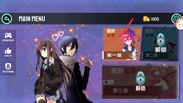 1、进入【MAIN-MENU】界面,可选择已解锁的【爱的故事-第一章】开启剧情。