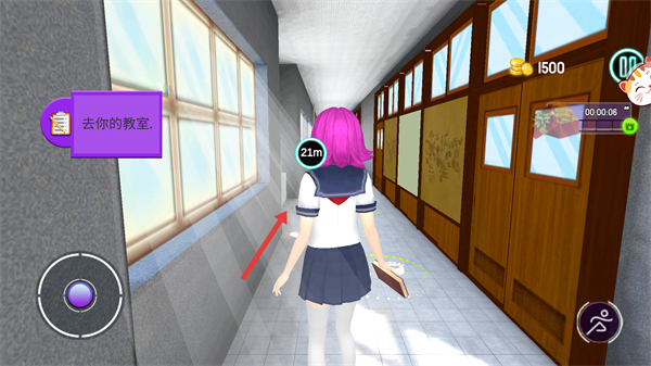4、根据【去你的教室】的提示,操控角色向目标移动,留意当前【距离-21m】及计时,顺利抵达教室以推进剧情。